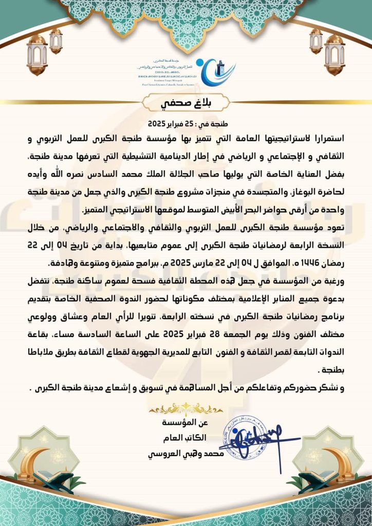 بلاغ مؤسسة طنجة الكبرى للعمل التربوي و الثقافي و الإجتماعي و الرياضي نشر في 25 فبراير 2025 الساعة 20 و 22 دقيقة طنجةبريسhttps://tangerpress.com/news-54277.html شارك FacebookWhatsAppTwitterالبريد الإلكترونيLinkedinطباعة