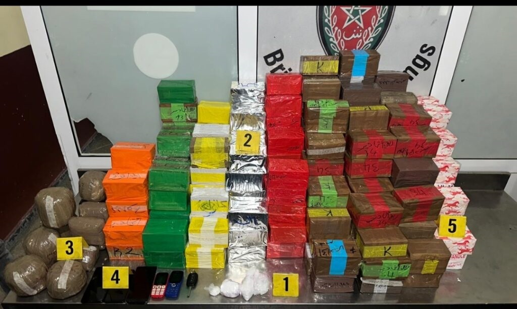 وجرى توقيف المشتبه فيهما بنقطة الأداء بمنطقة أمسكرود، شرق مدينة أكادير، مباشرة بعد وصولهما على متن سيارة خفيفة تحمل لوحة ترقيم مزورة، قادمة من إحدى مدن شمال المملكة، حيث أسفرت عملية التفتيش المنجزة في إطار هذه القضية عن حجز 150 كيلوغراما من مخدر الشيرا، وشحنة من مخدر الكوكايين تزن 210 غرامات، فضلا عن كمية من مسحوق القنب الهندي.