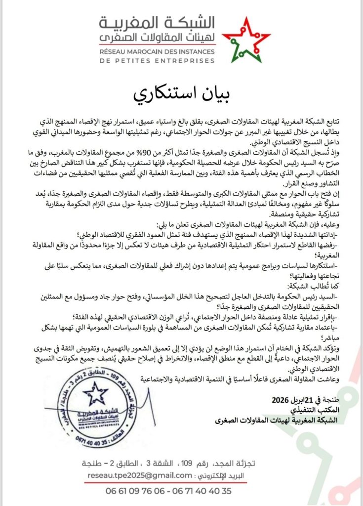 بيان استنكاري: في إطار التزامنا الدائم بالدفاع عن مصالح المقاولات الصغرى بالمغرب